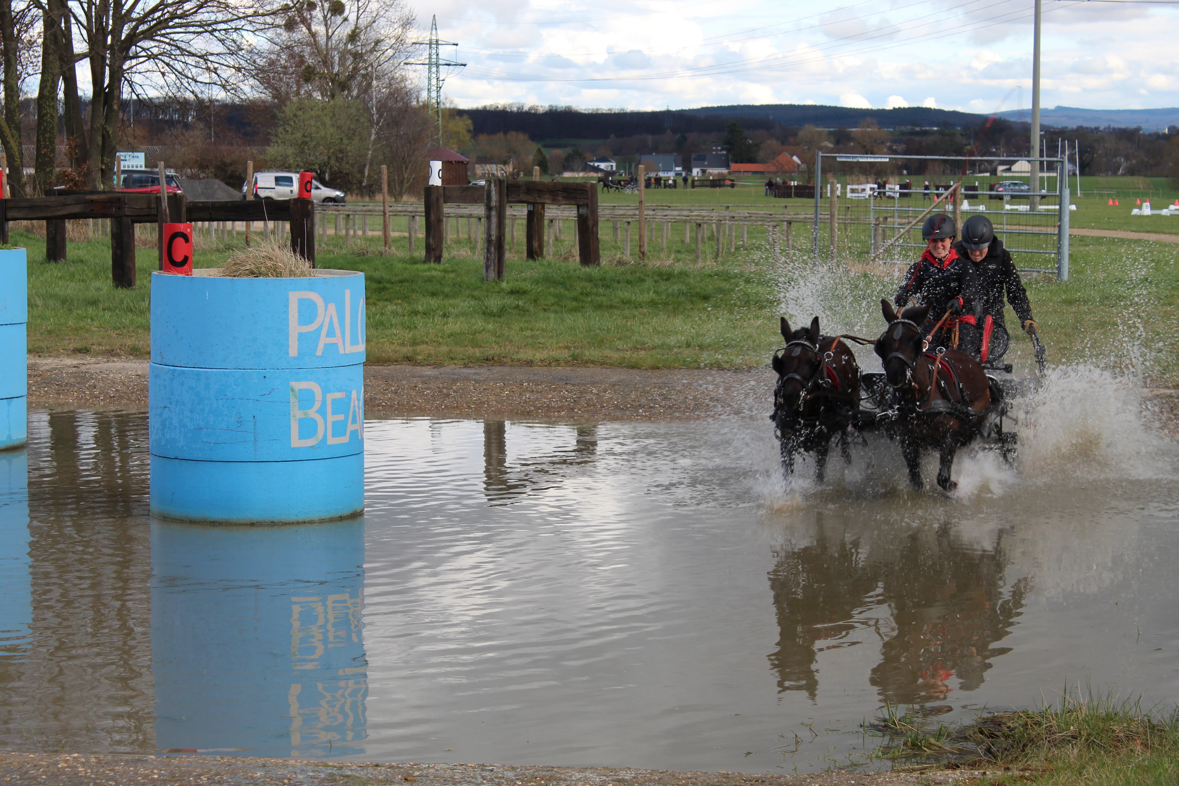 Am Ende des Tages durfte das Hindernis mit dem Wassergraben nicht fehlen. Hier sind unsere Gespanne ganz vorne dabei und testeten schon einmal die Wasserqualität, Wassertiefe und die Temperatur. So viel sei erwähnt – zum Baden ist es noch etwas zu kühl…
